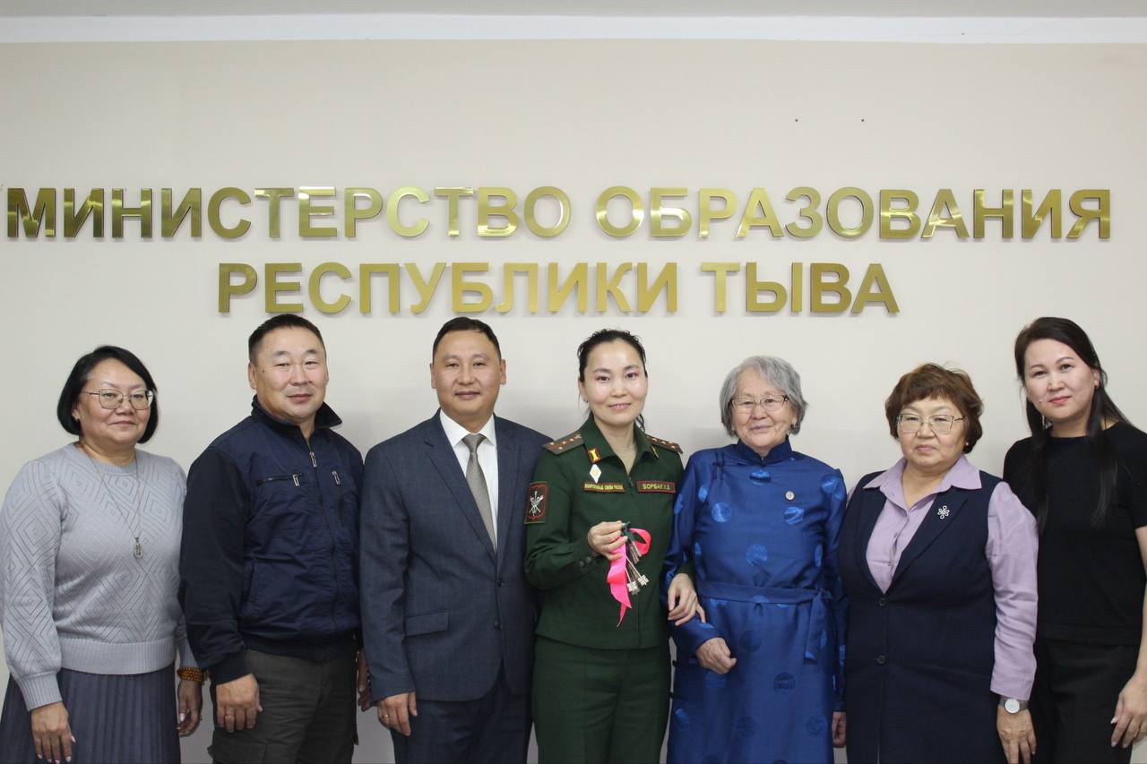 Министр образования Республики Тыва Орлан Соян вручил ключи от квартиры Херелмаа Борбак, капитану медицинской службы, военному врачу и участнику специальной военной операции.