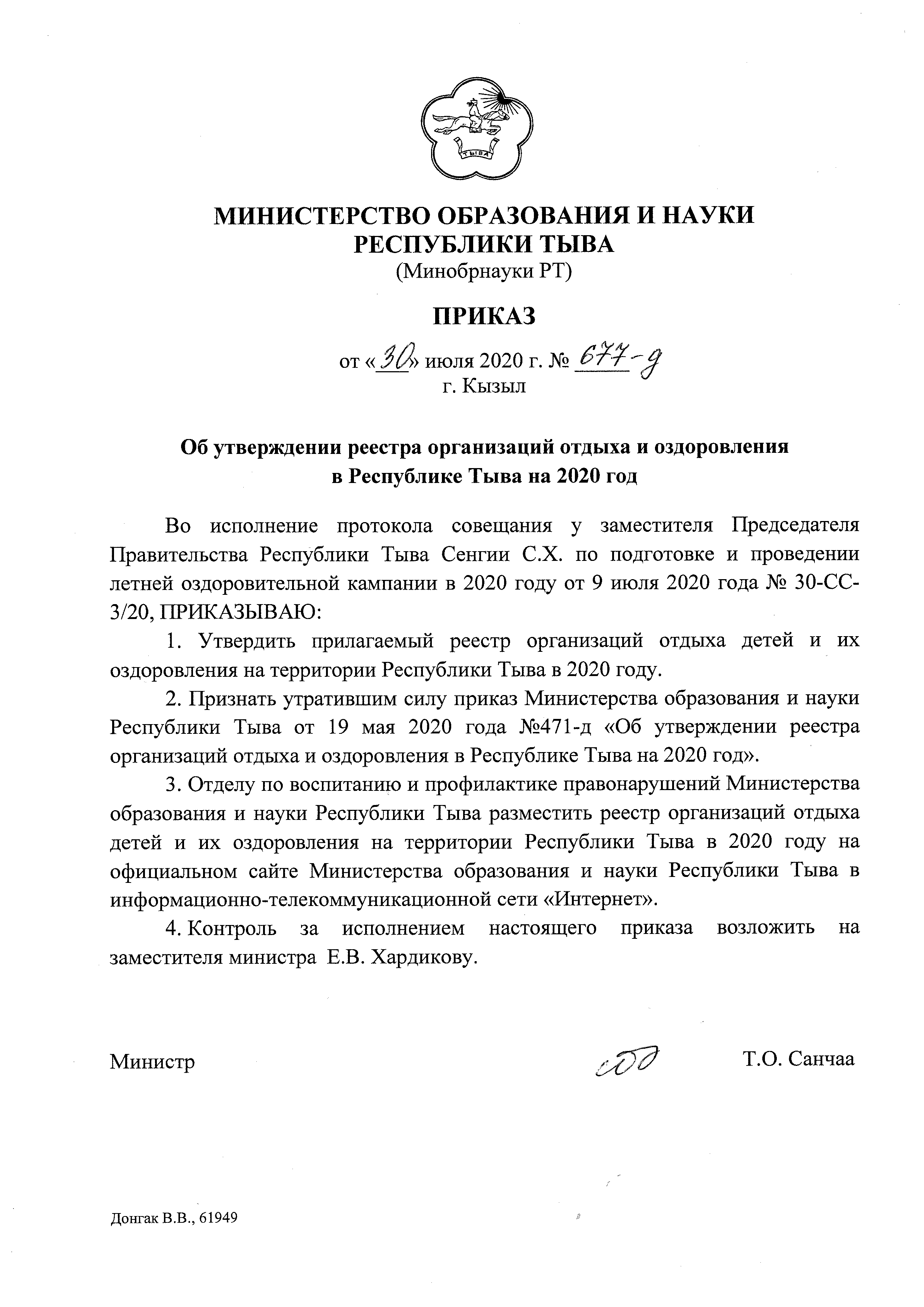 Просмотров: 7226 Приказ МОиН РТ №677-д от 30.07.2020 "Об утверждении реестра организаций отдыха и оздоровления в Республике Тыва на 2020 год" Титульный лист Распределение Стационарные лагеря Приказ МОиН РТ №471-д от 19.05.2020 "Об утверждении реестра организаций отдыха детей и их оздоровления на территории Республики Тыва на 2020 год" Титульный лист Распределение Стационарные лагеря Назад Вперёд
