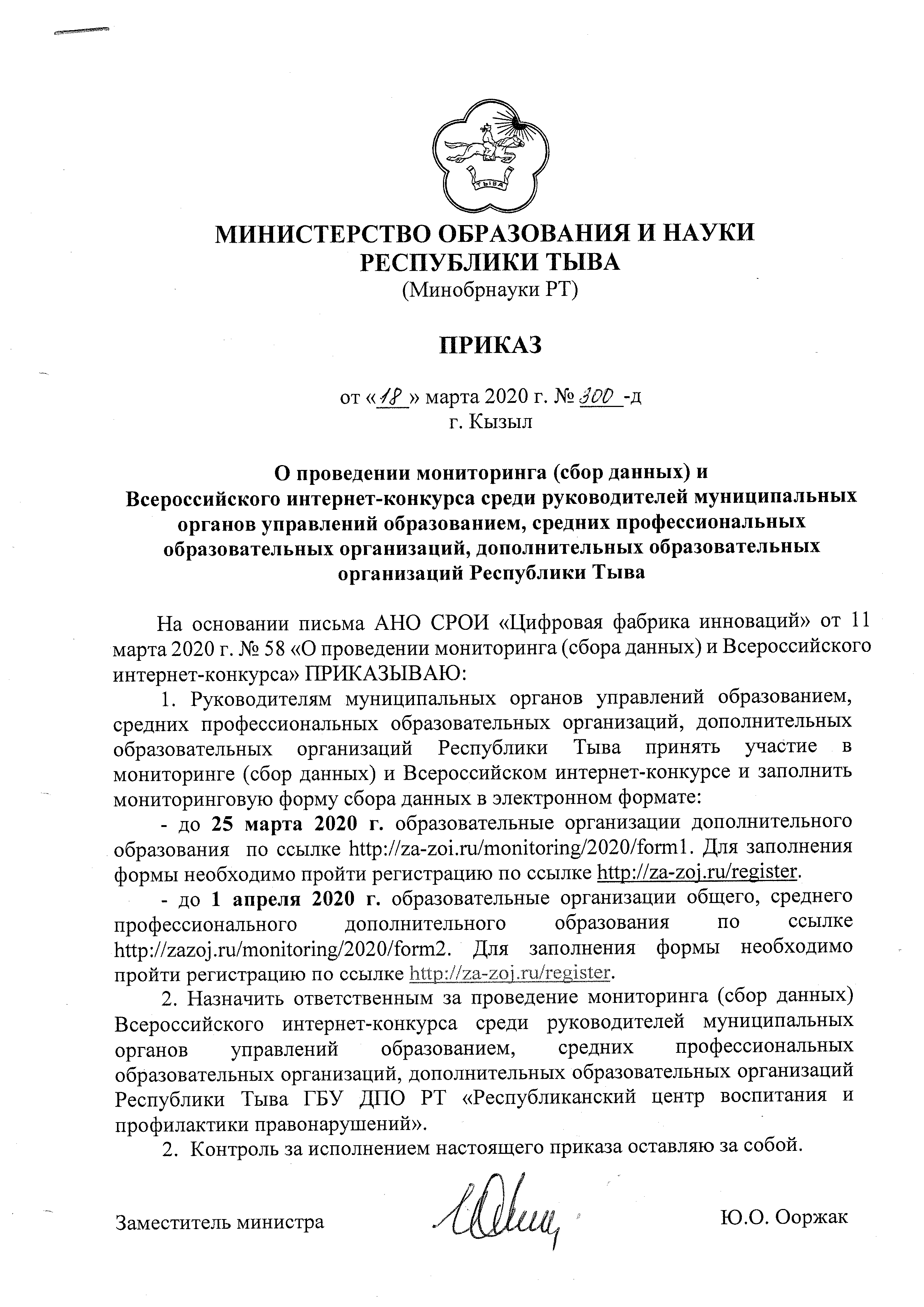 - Приказ МОиН РТ №200-д от 18.03.2020 "О проведении мониторинга (сбор данных) и Всероссийского интернет-конкурса среди руководителей муниципальных органов управлений образованием, средних профессиональных образовательных организаций, дополнительных образовательных организаций РТ"