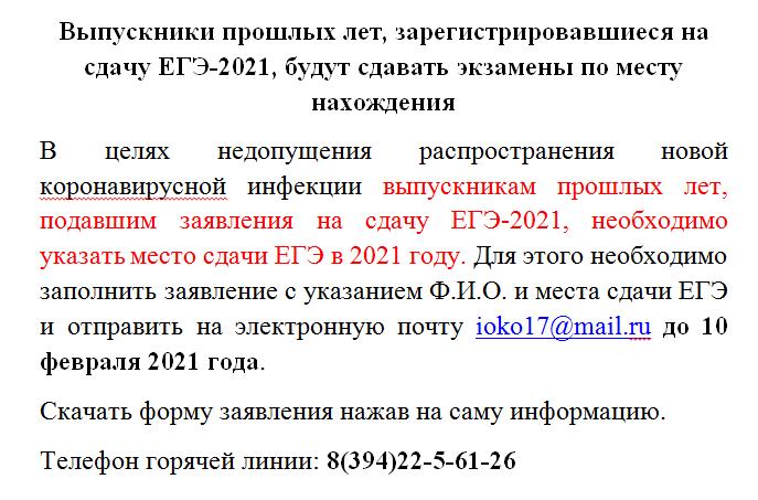 Вы здесь: Новости Выпускники прошлых лет, зарегистрировавшиеся на сдачу ЕГЭ-2021, будут сдавать экзамены по месту нахождения