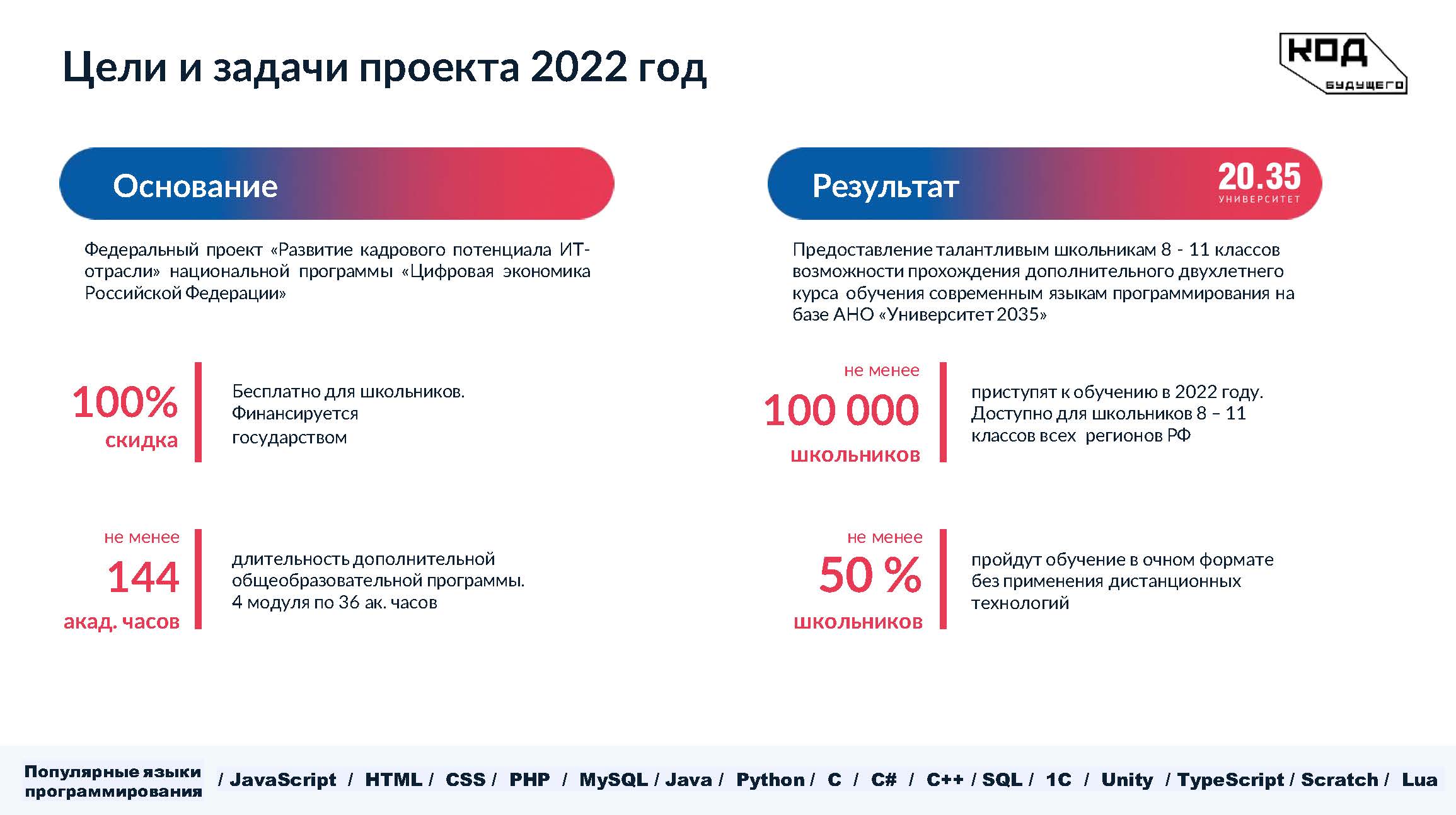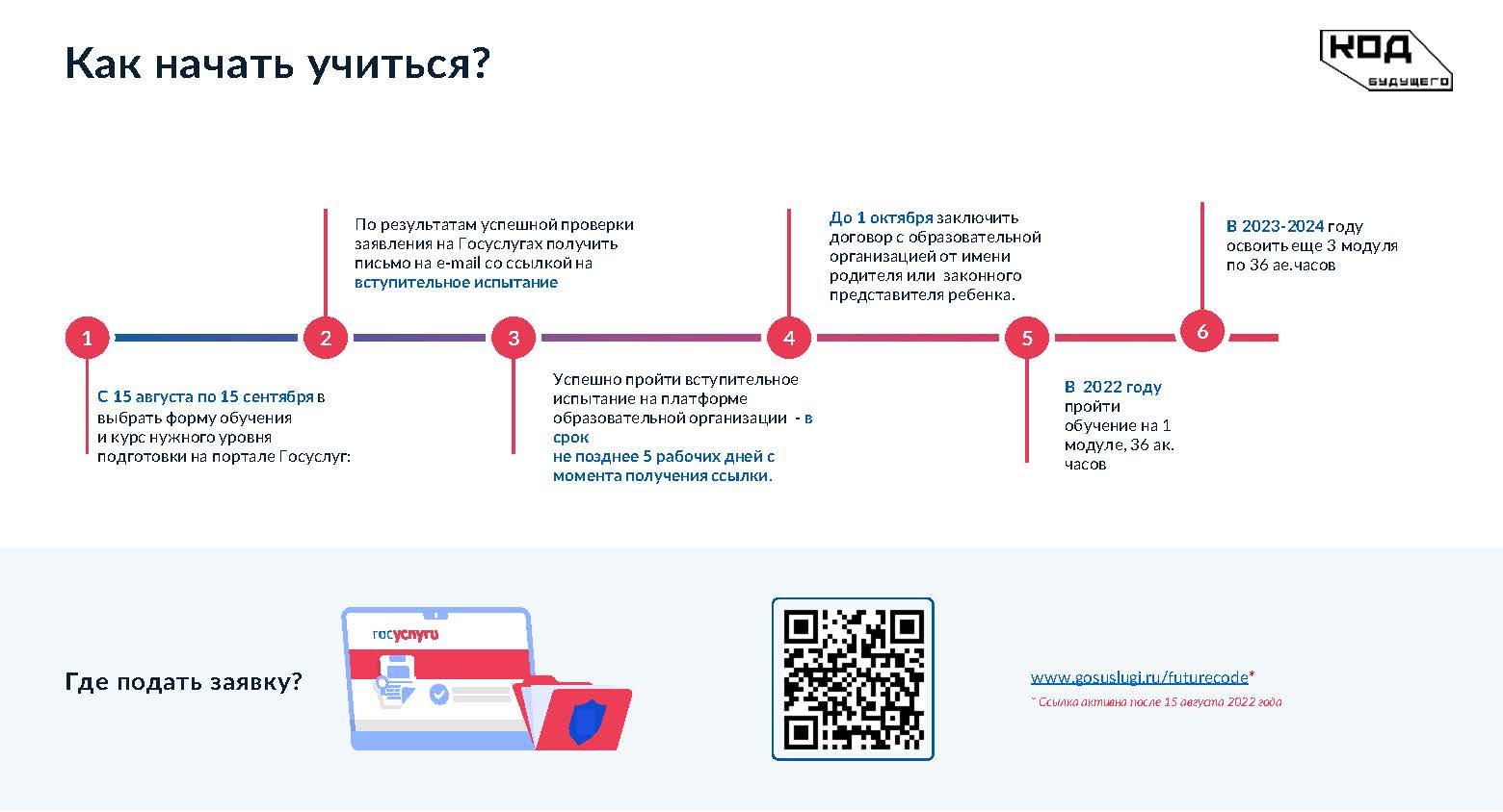В 2022 году не менее 100 тысяч талантливых школьников , обучающихся на образовательных программах основного общего и среднего общего образования 8–11 классов, смогут приступить к учебе на бесплатных курсах по программированию в онлайн и офлайн-форматах. Набор участников проекта «Код будущего» запланирован на портале Федеральной государственной информационной системы «Единый портал государственных и муниципальных услуг (функций)», начиная с 15 августа 2022 года. Обучение стартует в сентябре-октябре 2022 года.