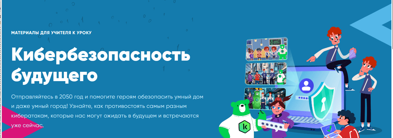 В рамках урока школьники отправиться в 2050 год и попробуют представить, какие могут ожидать киберугрозы. Научаться понимать, какие угрозы для умных устройств встречаются уже сегодня, что может их ожидать в будущем и как защитить свои девайсы, а какие из них актуальны уже сейчас. В данном уроке их ждут 3 совершенно разных тренажера с уникальными вселенными, героями и задачами. Младшим классам предложено обезопасить умный дом, средним расскажут о носимых устройствах, а старшим предложат спасти умный город!
