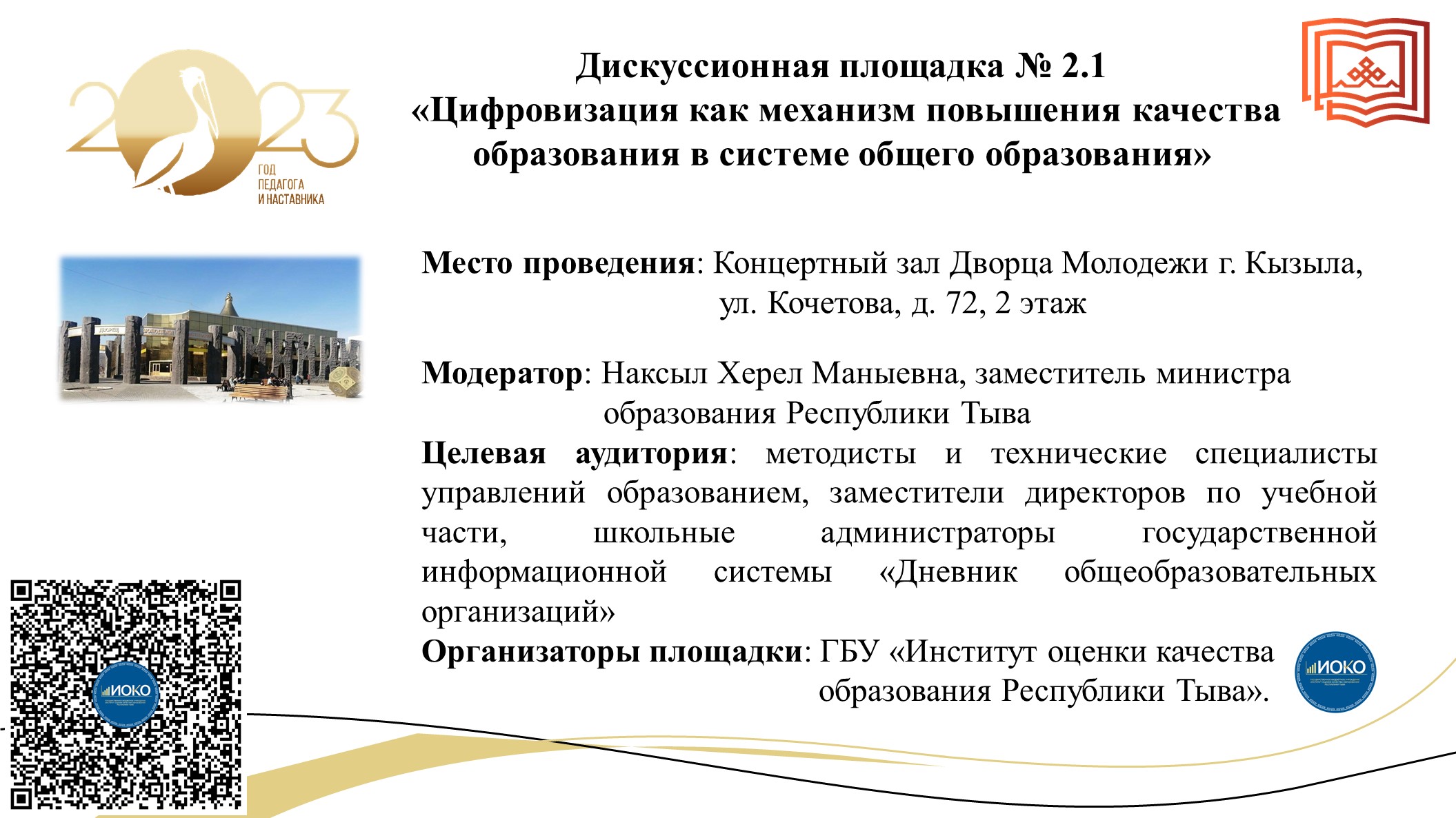 - «О методических аспектах цифровизации системы общего образования в Республике Тыва» – Донгак Виктория Викторовна, директор ГБУ «Институт оценки качества образования РТ»