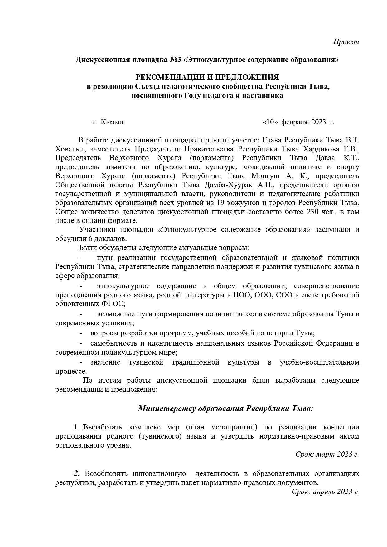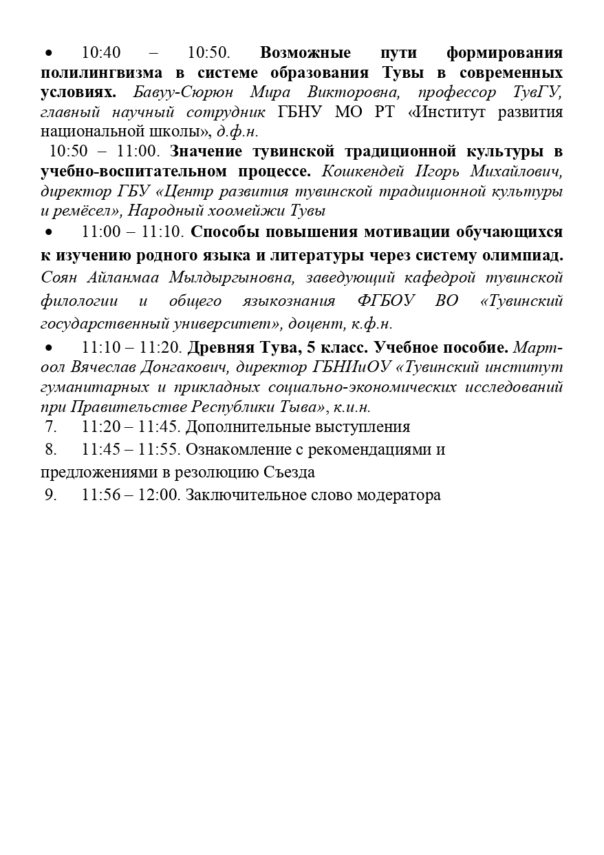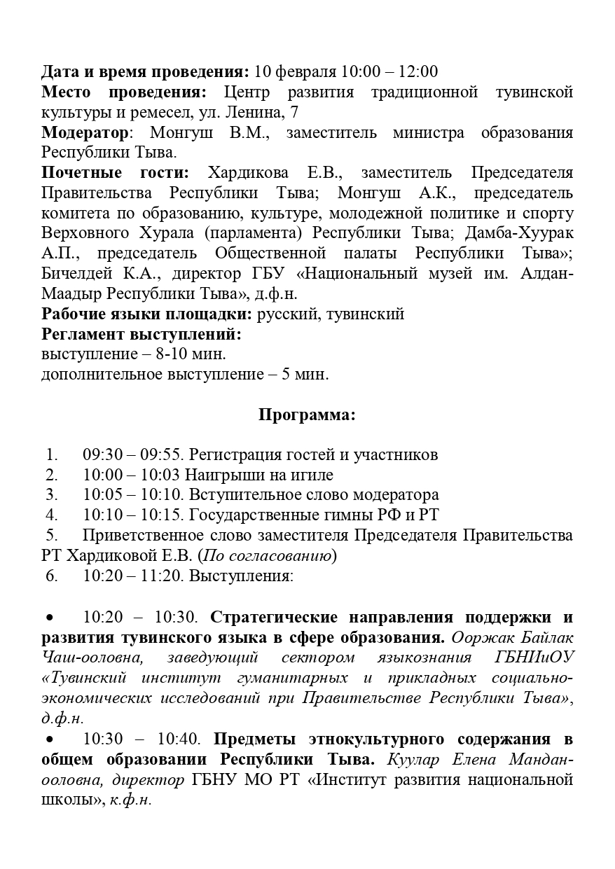 Дискуссионная площадка №3 «Этнокультурное содержание образования в регионе»Опубликовано: 02.02.2023 15:54 | Просмотров: 306 Онлайн-трансляция: Стратегические направления поддержки и развития тувинского языка в сфере образования Ооржак Байлак Чаш-ооловна ПРЕДМЕТЫ ЭТНОКУЛЬТУРНОГО СОДЕРЖАНИЯ В ОБЩЕМ ОБРАЗОВАНИИ РЕСПУБЛИКИ ТЫВА Куулар Елена Мандан-ооловна Возможные пути формирования полилингвизма в системе образования Тувы в современных условиях Бавуу-Сюрюн Мира Викторовна Значение тувинской традиционной культуры в учебно-воспитательном процессе Кошкендей Игорь Михайлович “ОЛИМПИАДАЛАР СИСТЕМАЗЫН ДАМЧЫШТЫР ТѲРЭЭН ДЫЛ БОЛГАШ ЧОГААЛДЫ ѲѲРЕНИРИНГЕ СОНУУРГАЛДЫ ОТТУРАРЫНЫҢ, КҮШТЕЛДИРЕРИНИҢ АРГАЛАРЫ” Соян Айланмаа Мылдыргыновна История Древней Тувы. 5 класс Март-оол Вячеслав Донгакович Назад Вперёд